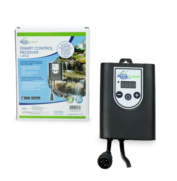 The smart receiver also includes an integrated control panel with digital numeric display and quick-and-easy flow adjustment. The receiver includes a weather-proof, quick-connect fitting for quick and secure setup. The Aquascape Smart Control Receiver Large is only compatible with SLD 5000-9000 Adjustable Flow Pond Pump. An optional Universal Remote for Adjustable Flow Pumps (Item #45041) is available separately, allowing for wireless pump control without the use of a smartphone or tablet. The Smart Control Receiver Large is compatible with iPhone and Android operating systems and adequate wireless coverage is required (2.4 GHz supported). The Smart Control Receiver Large is backed by a 3-year limited warranty to ensure years of reliable use.